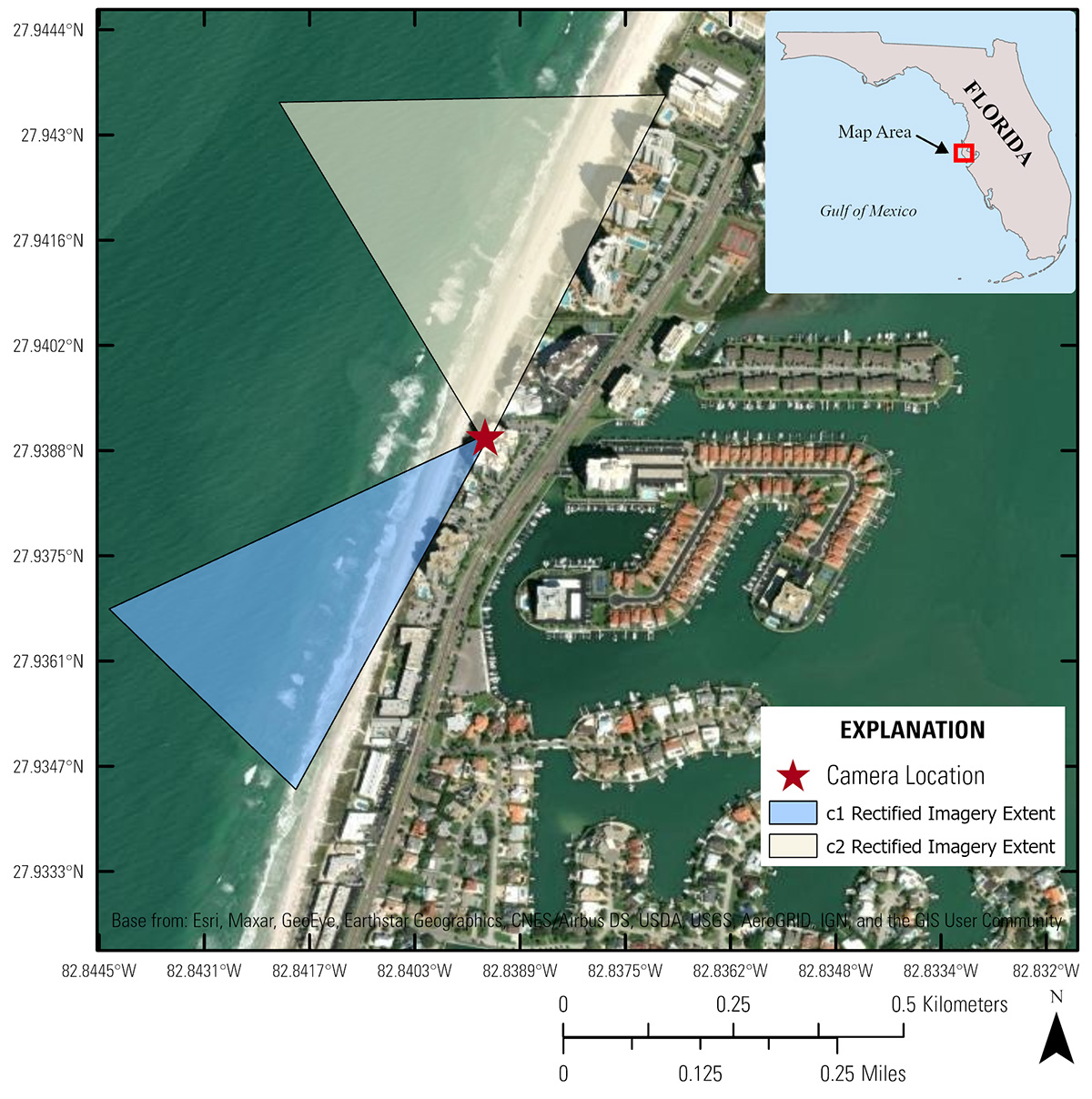 Figure 1. Regional map showing the CoastCam location (red star) and spatial extent of rectified imagery from camera 1 (c1) and camera 2 (c2) at Sand Key, Florida.