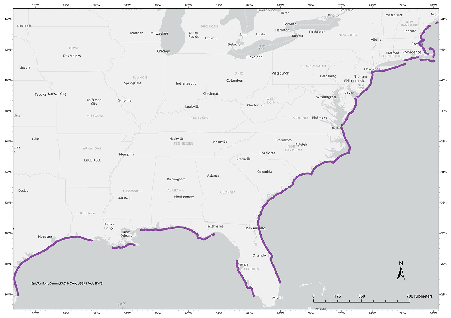 Figure 1. Location map (purple lines) showing the areas where overwash extent data were collected for Hurricanes Matthew, Irma, Florence, Michael, Laura, Sally, Delta, Zeta, Isaias, and Ian in the southeastern coasts of the United States.